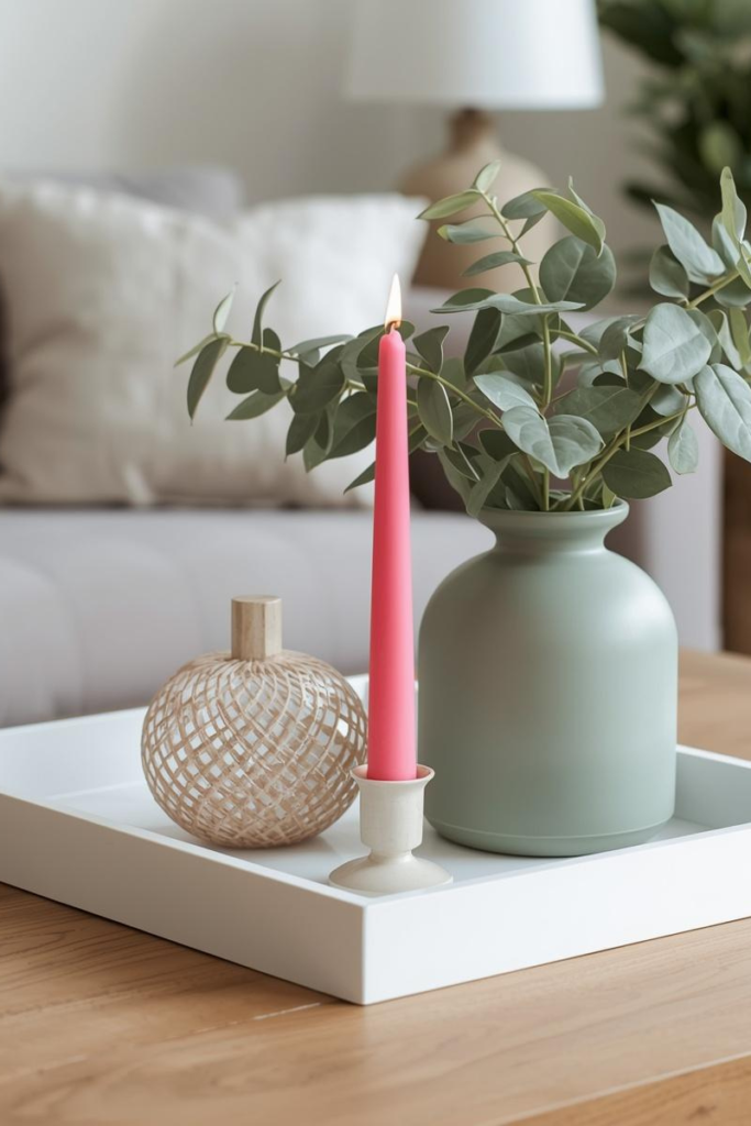 Don’t be afraid to mix colors! A great way to do this is by combining earthy tones with a bright “pop.” For example, try a trio of sage green, neon pink, and white. You could have a tall sage green vase, a small neon pink candle for a splash of fun, and a white textured book or tray to balance them out. Mixing these textures ensures the colors feel sophisticated and sharp.